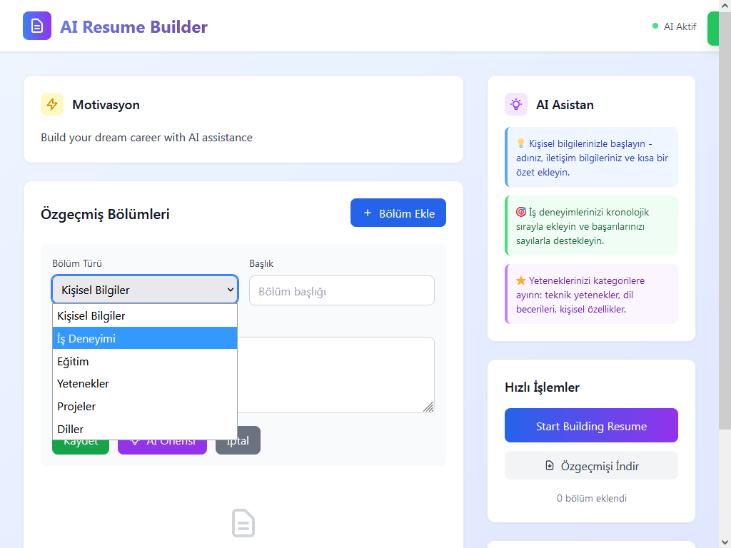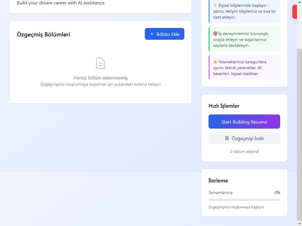 AI Resume Builder — Yapay Zekâ destekli özgeçmiş oluşturma platformu ile kariyer hedeflerinize bir adım daha yaklaşın. Platform, “Kişisel Bilgiler”, “İş Deneyimi”, “Eğitim”, “Yetenekler”, “Projeler”, “Diller” gibi bölümleri kolayca eklemenize ve düzenlemenize olanak tanır. Akıllı asistan sayesinde; iletişim bilgilerinizden kısa özetinize kadar doğru ve etkili içerikler oluşturabilirsiniz. Bölümlerinizi oluştururken başarılarınızı sayılarla destekleyip yeteneklerinizi teknik, dil ve kişisel olarak kategorize edebilirsiniz. Kullanıcı dostu arayüz: “Start Building Resume” butonuna tıklayarak kolayca başlasınız, ardından özgeçmişinizi indirebilirsiniz.